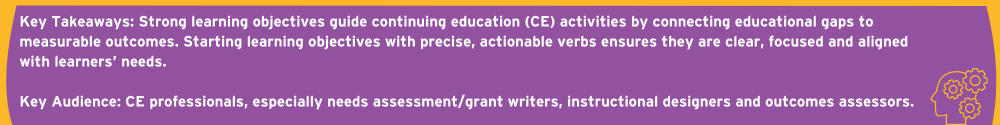 Learning objectives are written with the intent to improve the knowledge, skills and performance of healthcare professionals — and in this sense, they are an integral part of the larger goal of CE to improve patient outcomes. A well-crafted learning objective provides direction to a CE activity, showing how education can be translated into meaningful changes in real-world practice and ultimately driving advancements in patient care. Importantly, even as outcomes frameworks in CE for healthcare professionals continue to evolve, the concepts and tools presented here will remain constant as a foundation for bridging educational gaps to desired outcomes.