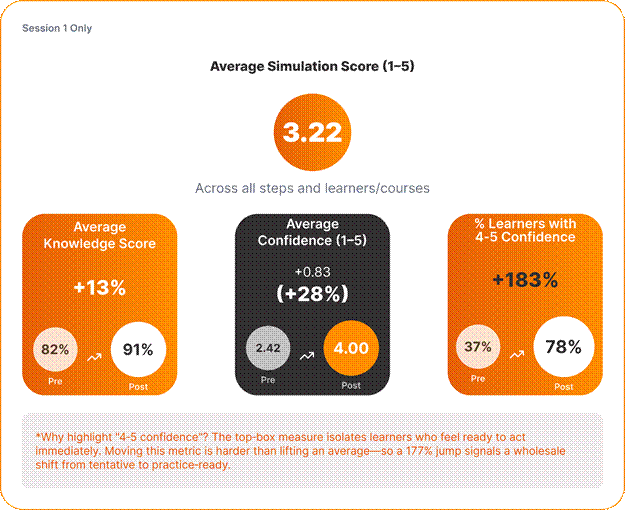 These data suggest that a single exposure to an AI‑driven simulation can meaningfully enhance learner confidence and knowledge. The 28% relative increase in confidence and the 183% increase in the proportion of learners reporting high confidence align with gains reported in external research.[4-5] The knowledge improvement of 13% is comparable to effects observed in studies comparing AI‑powered virtual‑reality simulations with human‑controlled sessions.[3]