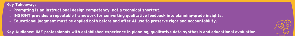 In IME planning, qualitative feedback may be summarized descriptively rather than subjected to systematic analytic approaches designed to identify and prioritize educational gaps. As AI tools are incorporated into qualitative workflows, the importance of clearly defined analytic frameworks and educational intent becomes more pronounced. Without these elements, AI-assisted analyses may yield surface-level thematic summaries with limited planning utility. The key consideration, therefore, is not AI capability, but how IME professionals structure its use to support analytic rigor and accountability.