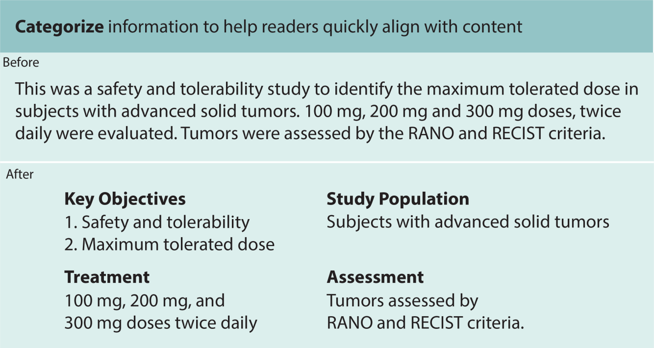 Most information can be organized in such a way as to help readers quickly align with the content and help them find relevant material, faster. Additionally, this step makes similarities and differences among categories of content more explicit (Clarke 2010). When categorizing your information, look for meaningful sections or repeating patterns. An example of categorizing information is shown below:
