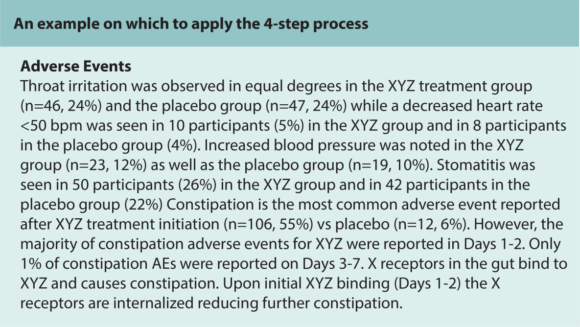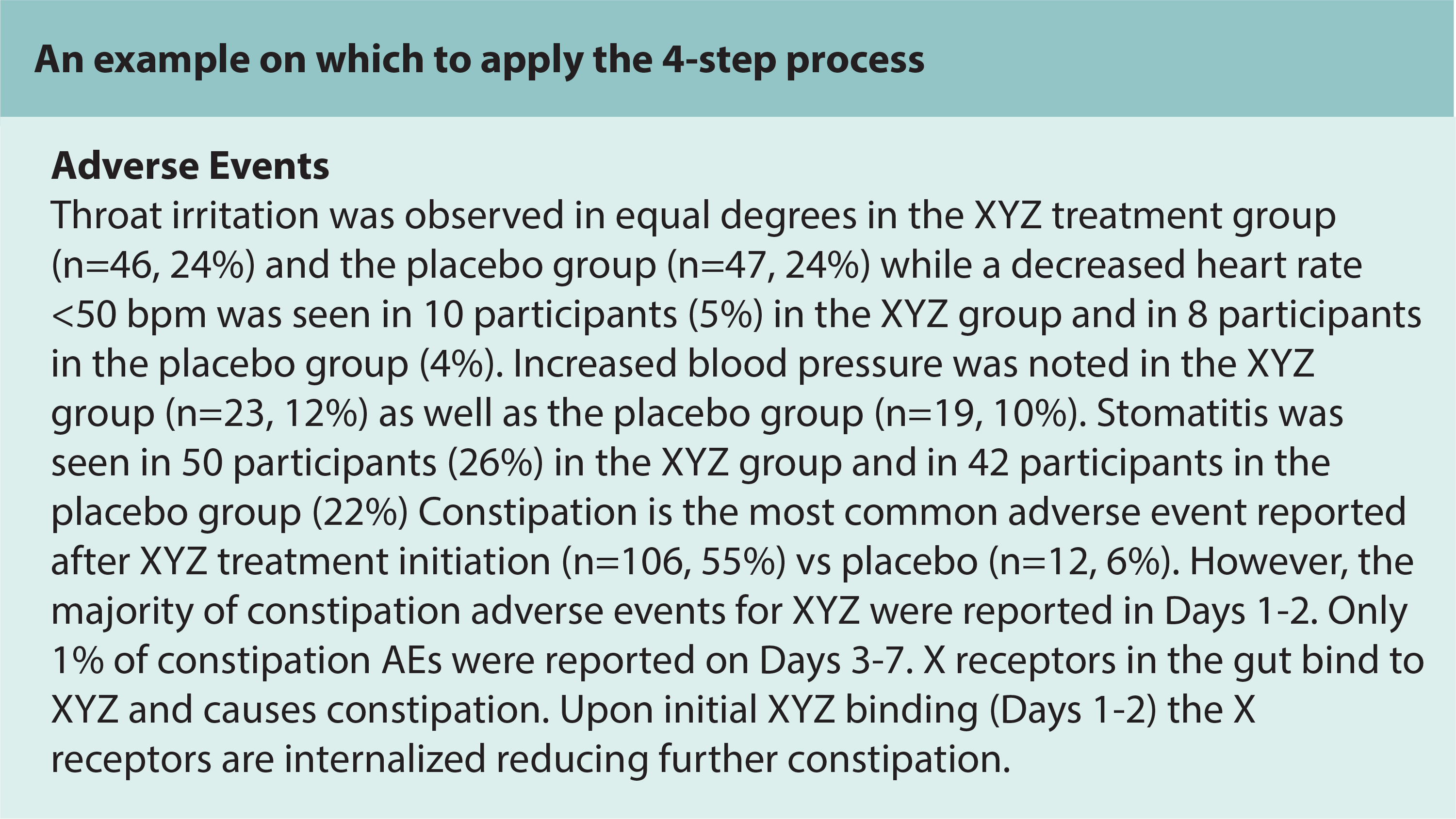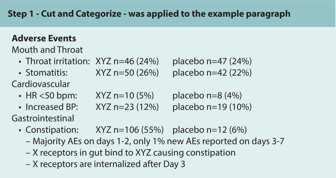We cut down much of the verbiage in the paragraph above, created bullets, and categorized each of the adverse events into body areas.