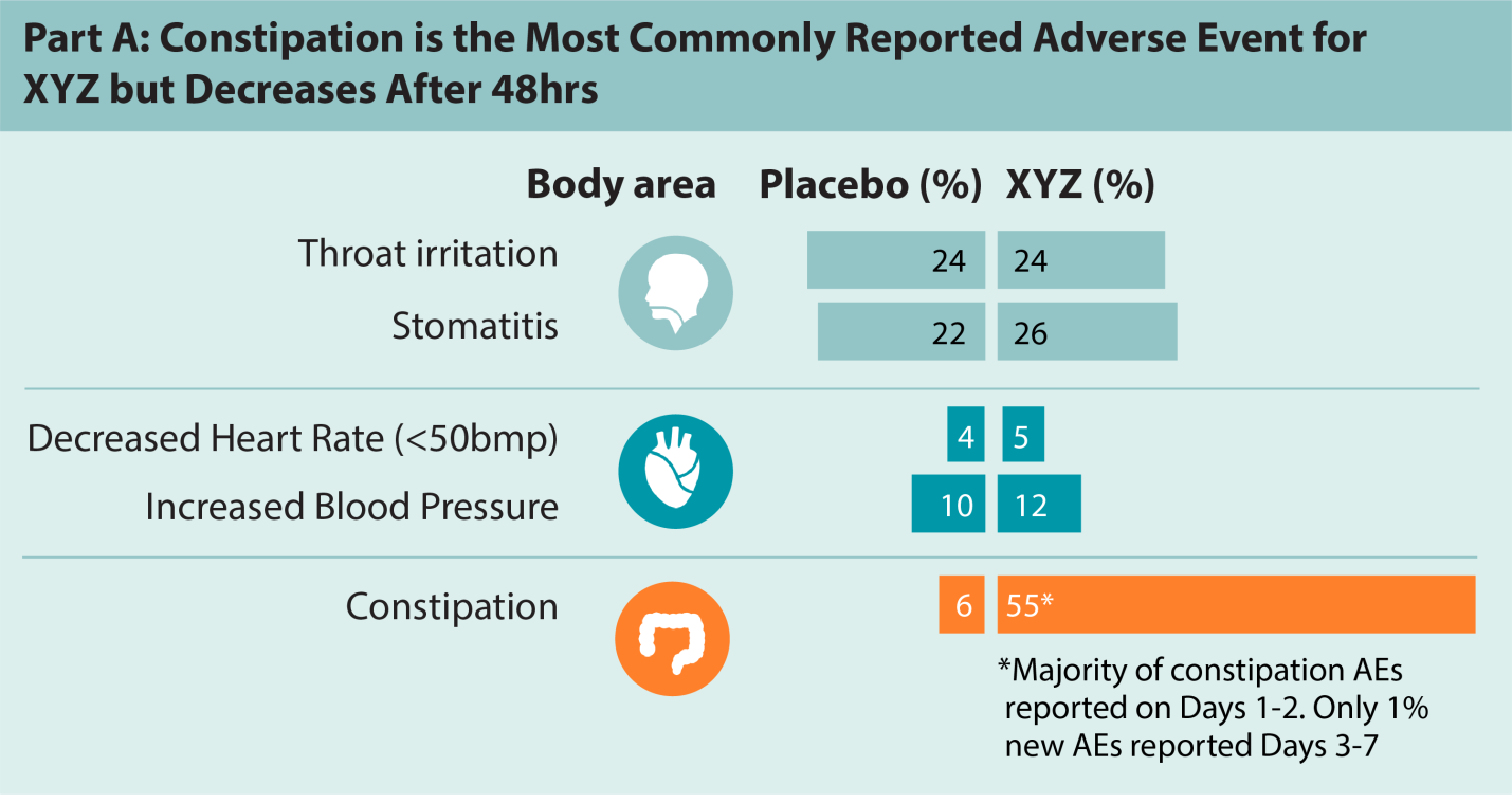 In the final step, in Part A, we used different colors for each body area, and orange to emphasize the adverse event of constipation, delineating it from the other AEs.