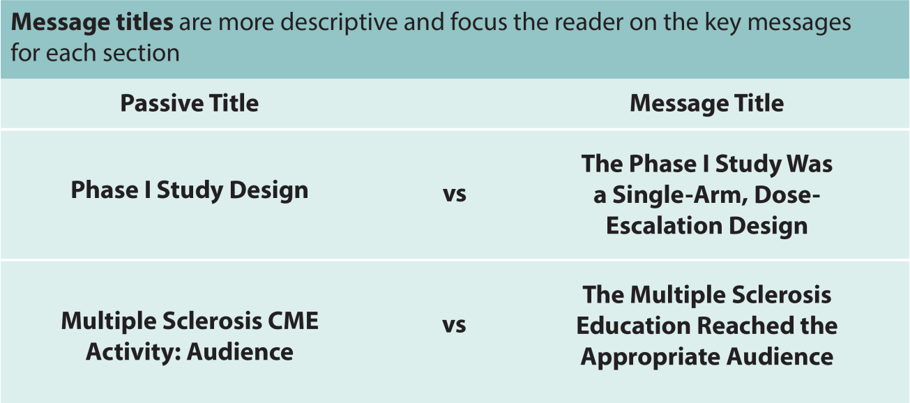 Clear and succinct message (or sentence) titles have been shown to be more effective than passive phrase titles in conveying technical information (Alley and Neeley, 2005) and aiding retention (Alley et al, 2006) in various audiences.