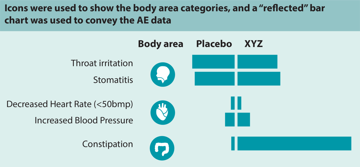 We decided to use icons to quickly convey each AE body area category. For the AE data, we used a “reflected” bar chart that effectively highlights the differences between the two data groups: