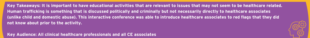 Additionally, interprofessional education (IPE) is increasingly recognized as a key driver of patient safety and systemic responsiveness. The World Health Organization (2010) has emphasized that IPE, where learners from multiple professions learn with, from and about each other, can lead to better collaboration and health outcomes. When addressing issues like human trafficking, where identification and intervention often depend on team-based effort, the integration of IPE and simulation offers a powerful, evidence-informed model for continuing education programs.