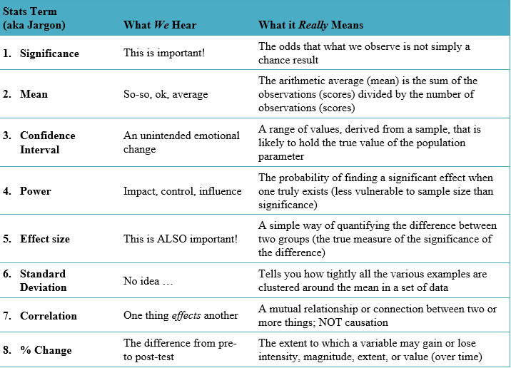 You don’t need to be a statistician to “talk stats,” nor is statistical jargon the most effective way to communicate the value and impact of your education. This article briefly explores analogs for statistical terms with explanations (including “translations” and examples), enabling educators of all proficiency levels to more confidently participate in meaningful data-driven conversations.