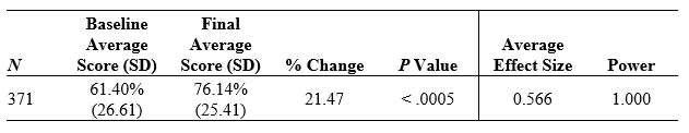 These findings, paired with a high level of power (1.0) and medium effect size (d = 0.57), provide strong, valid and reliable evidence that the education was effective in improving this sample’s proficiency.