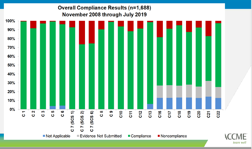 Identification and resolution of conflict of interest (COI) remains one of the biggest areas of non-compliance in the process of re-accreditation—and an area of most confusion by accredited providers. The ACCME classifies these processes within Criterion 7 and the Standards of Commercial Support (SCS 2) of the accreditation requirements. According to a recent 2019 ACCME compliance summary report, approximately 30% of providers are still being found non-compliant for SCS 2 as excerpted below.