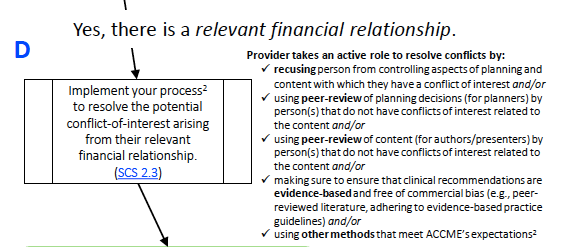 Lastly, even though you have identified and resolved all relevant COI for every person in control of content, the final step in resolution of COI is to monitor participant perception of bias. This means having a way to gather learner feedback for any perceived bias in the content of the activity, and then following up on any concerning comments for future process improvements.
