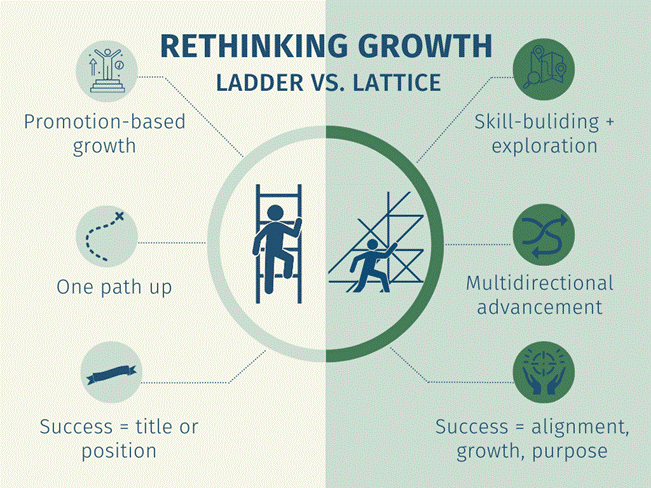 Careers are increasingly moving away from the traditional ladder toward a flexible lattice, embracing lateral moves, skill-building and nonlinear growth. As Suzan McDaniel, CHRO of Edward Jones, advises, “Don’t think about your career as being linear. Think about it more as a lattice” (DiDomenico, 2023). This visual comparison highlights the shift from traditional promotion paths to more exploratory, purpose-driven progress.